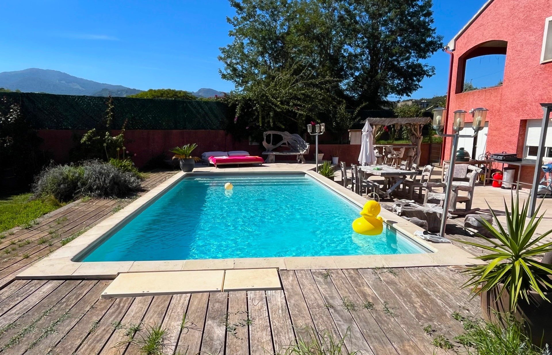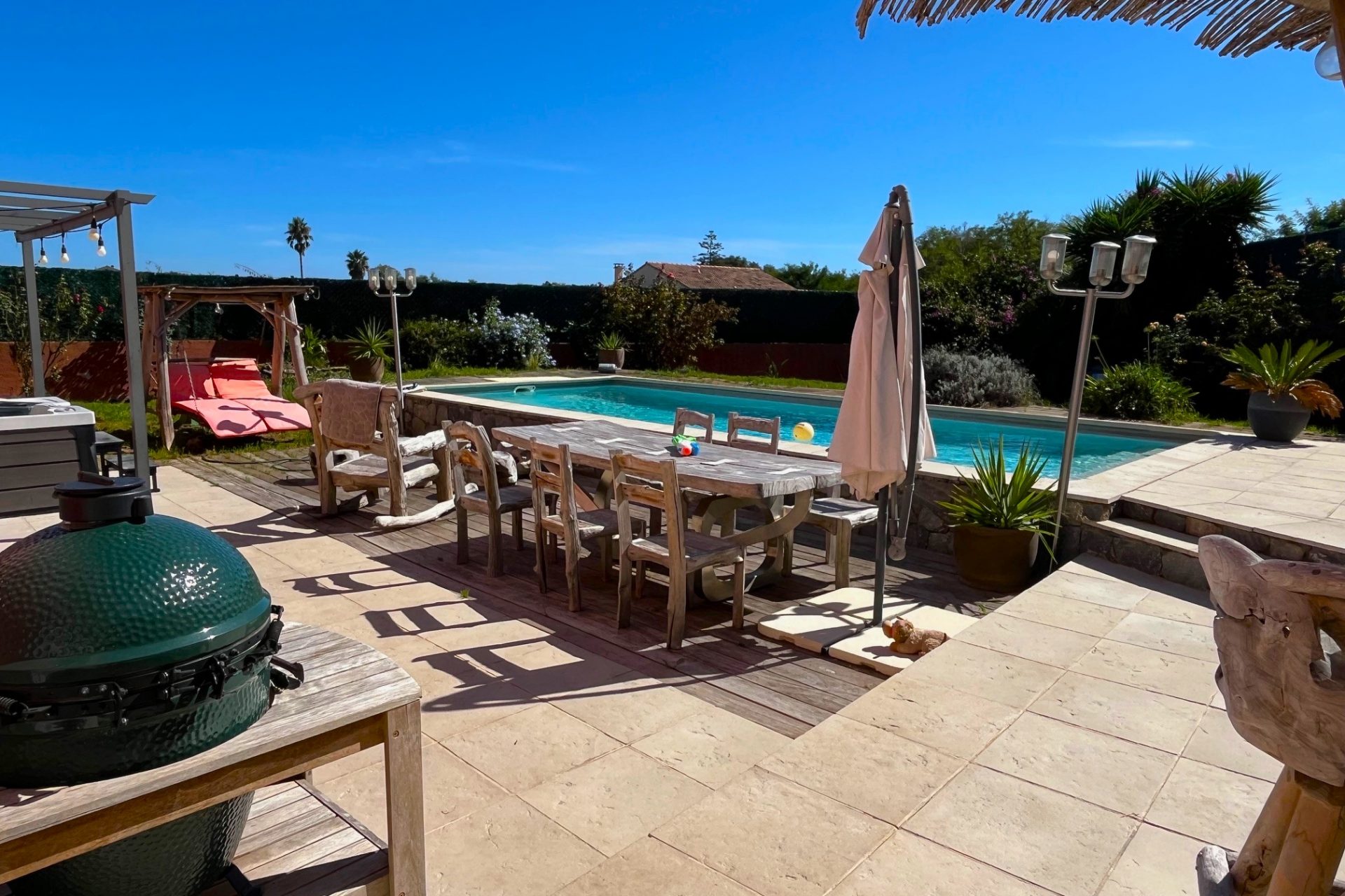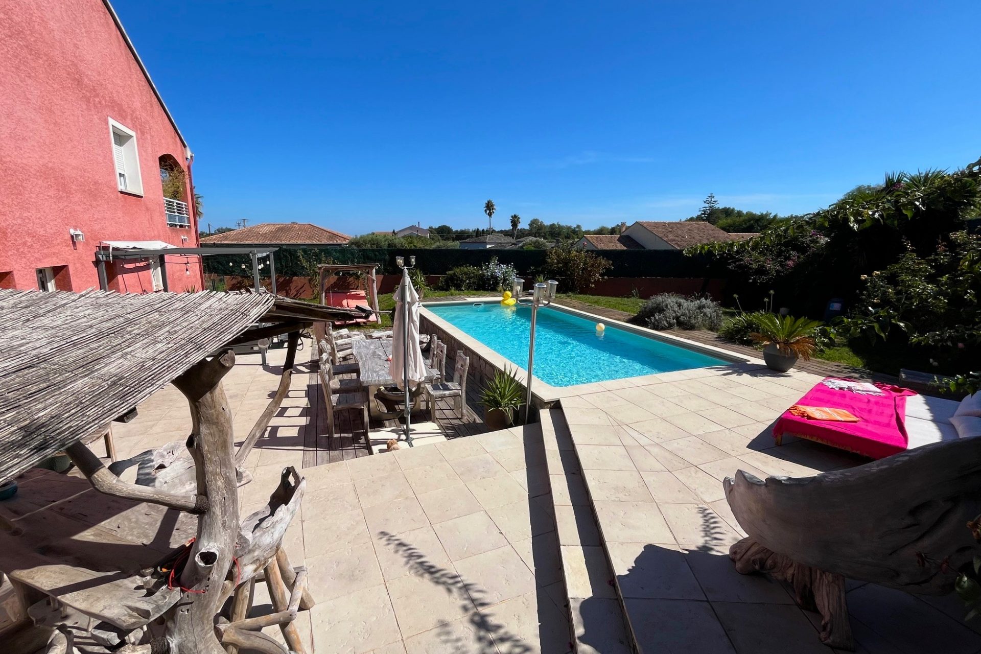 A VENDRE dans un environnement pavillonnaire belle maison de deux logements indépendants sur 1 098m² de terrain cloturé, arboré, pelousé avec piscine de 9×4. Dans un secteur au calme non loin des commerces et à 400m de la plage.