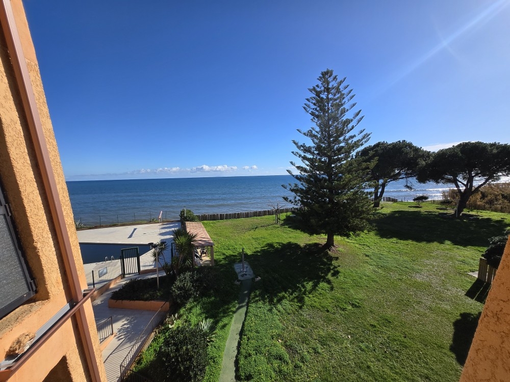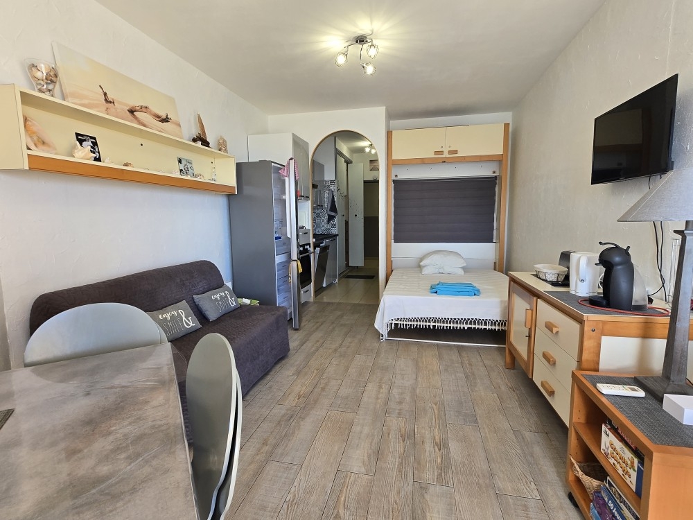 L’appartement offre une pièce de vie lumineuse, une salle d’eau WC ainsi qu’une kitchenette fonctionnelle. Sa terrasse, agréable et sans vis-à-vis, propose une vue dégagée sur la Méditérranée.