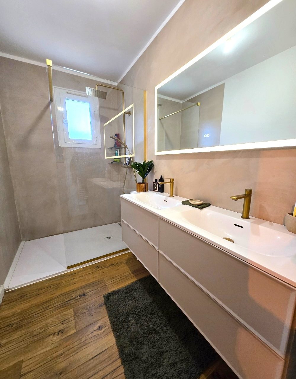 Cette villa comprend deux chambres avec dressings, une salle d’eau élégante et un WC séparé.