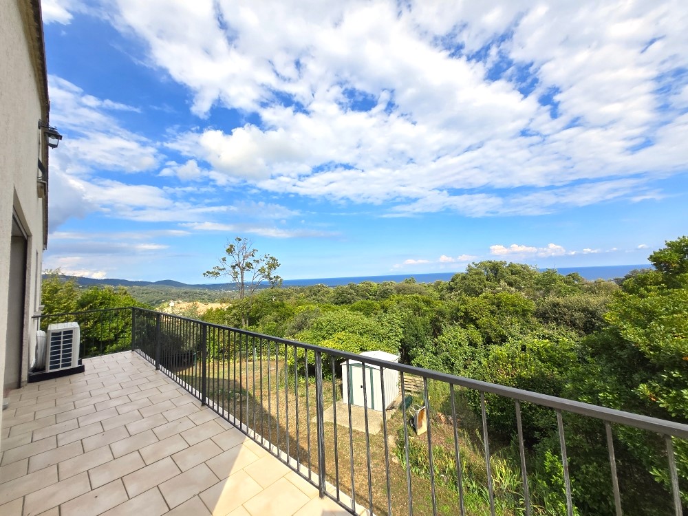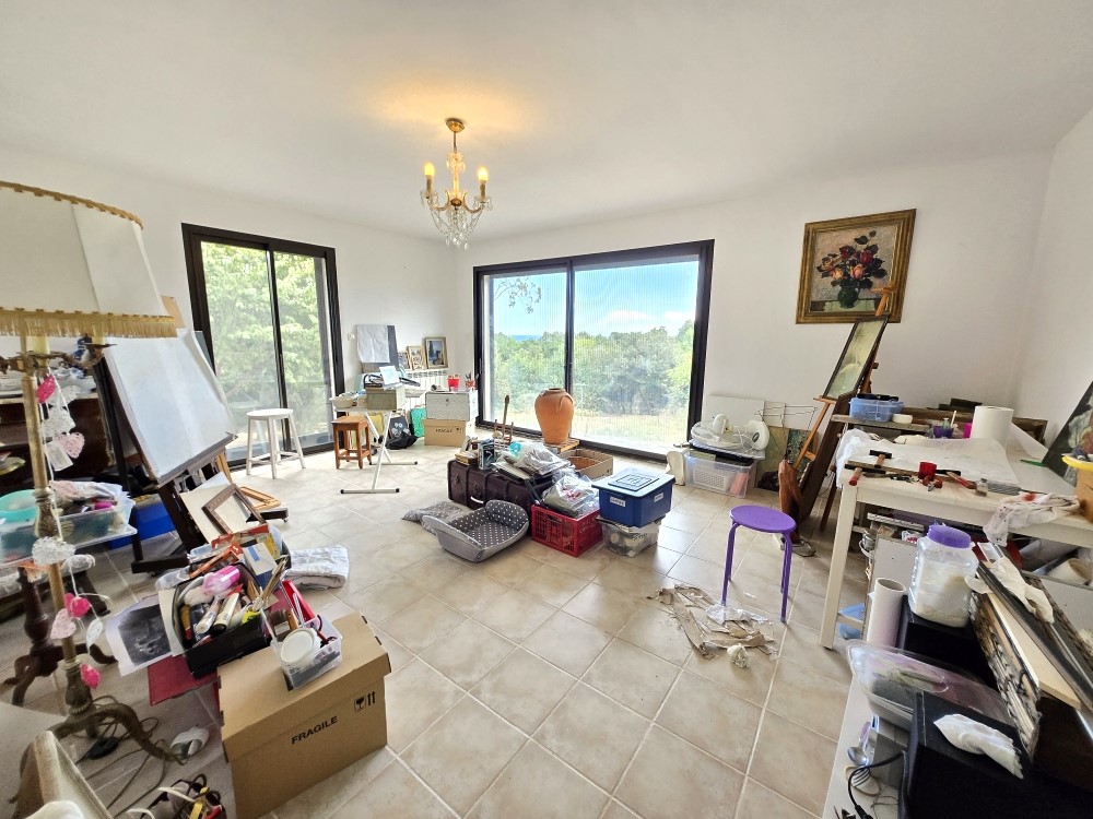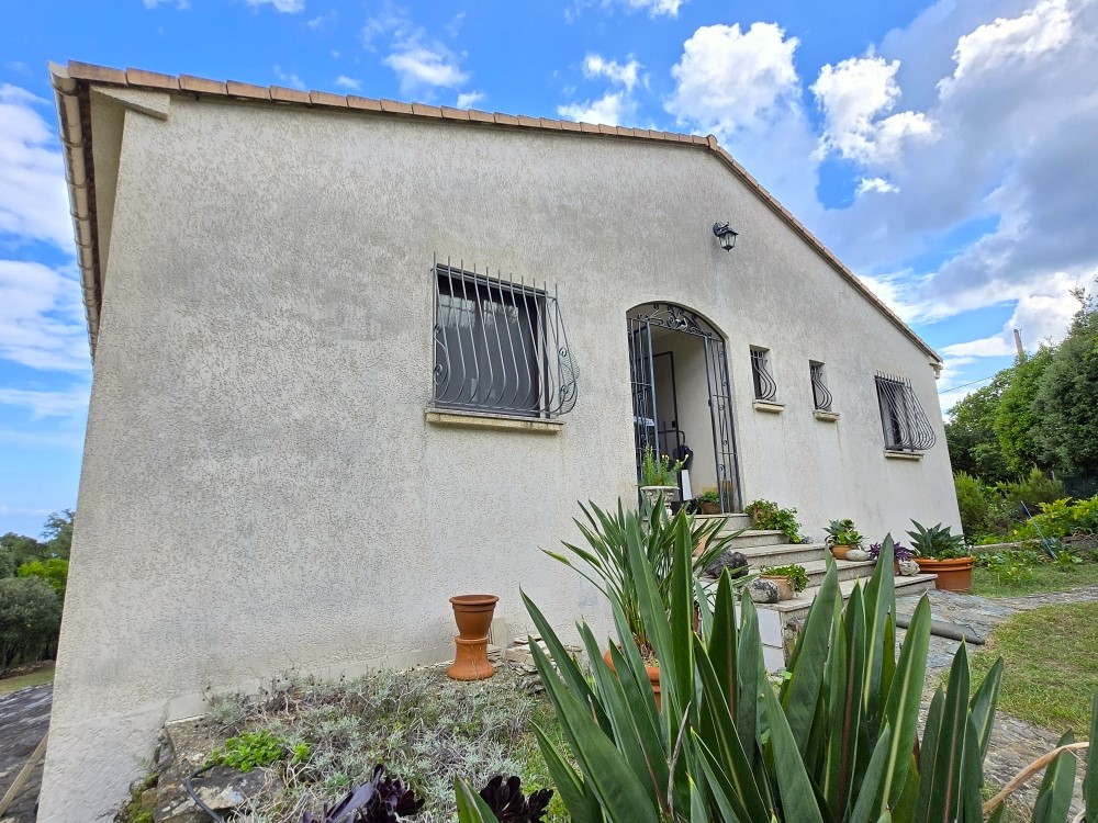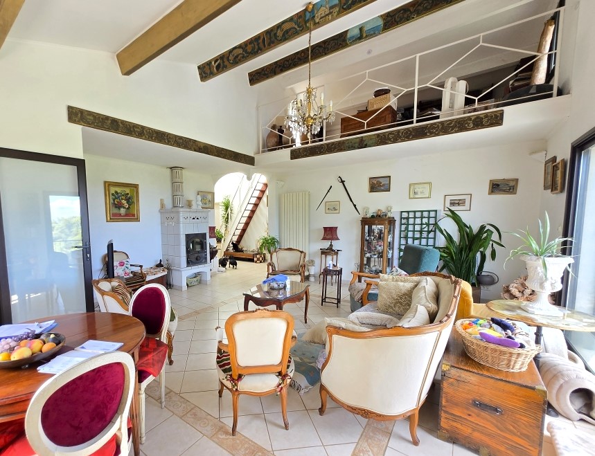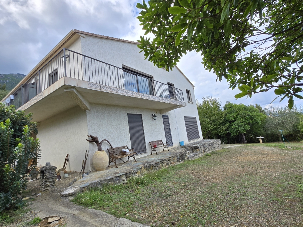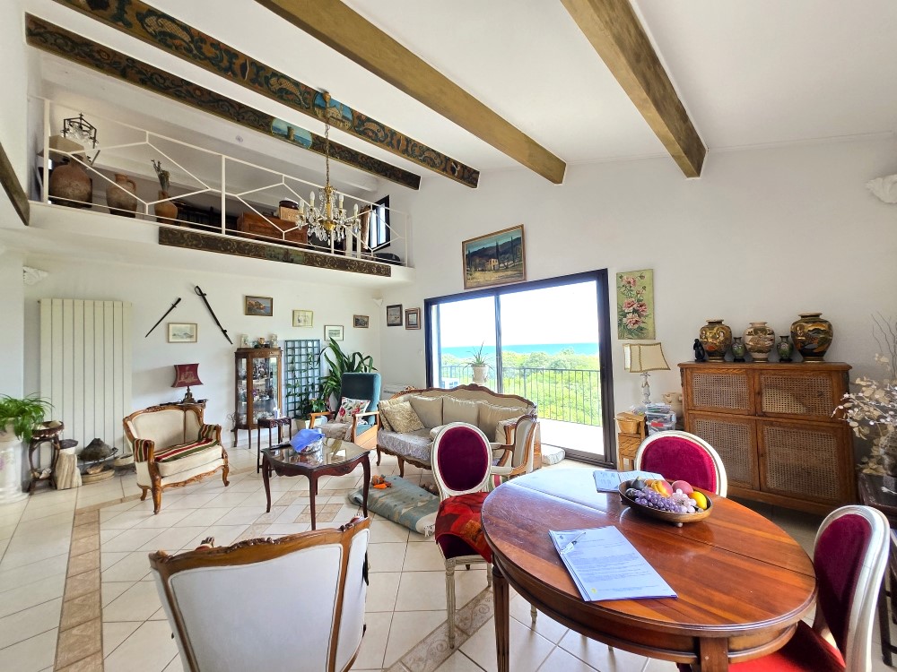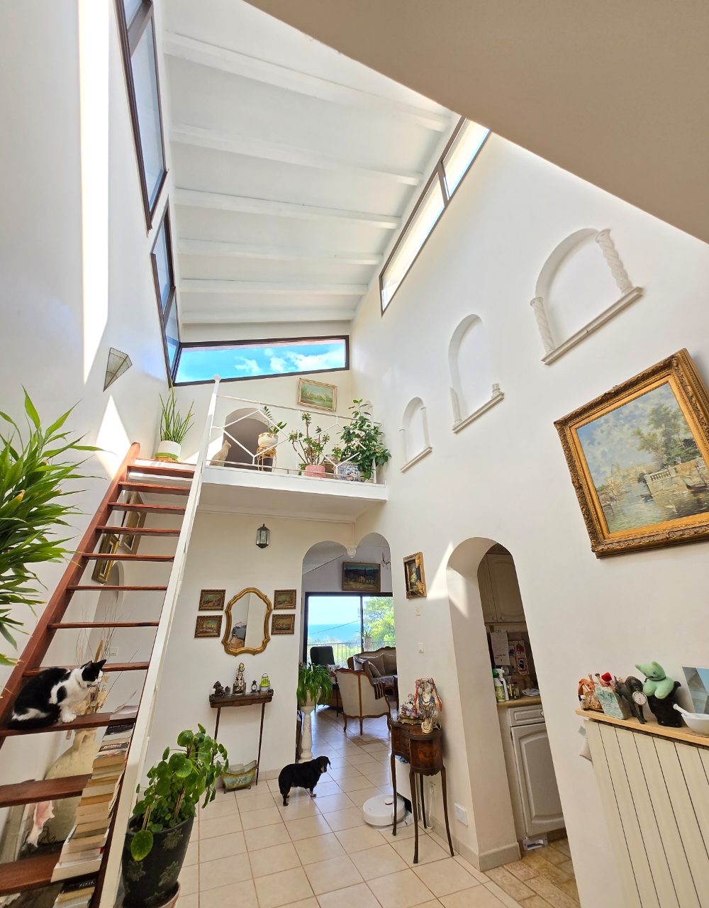 La maison est sur deux niveaux, la partie principale de plain-pied offre une surface habitable de 135 m² environ et se compose d’un hall d’entrée type cathédrale, d’une cuisine fermée avec sa loggia et sa vue montagne, un salon séjour avec mezzanine et sa vue mer, équipée d’un poêle à bois céramique et d’une climatisation réversible, un accès à la terrasse. Le coin nuit dispose de trois chambres, dont une avec sa douche, un bureau ou une 4e chambre, une salle de bains, un WC indépendant.