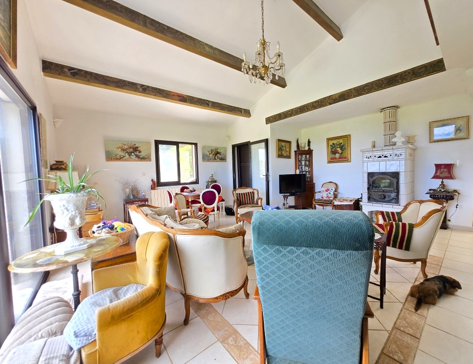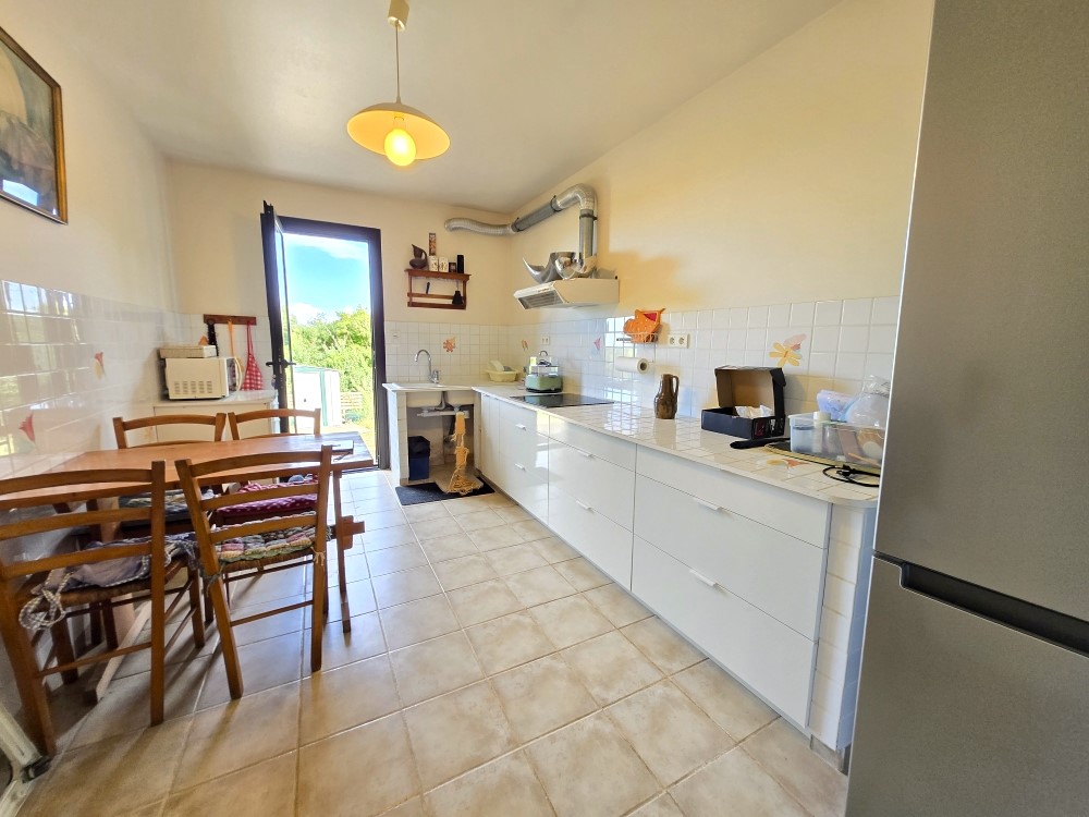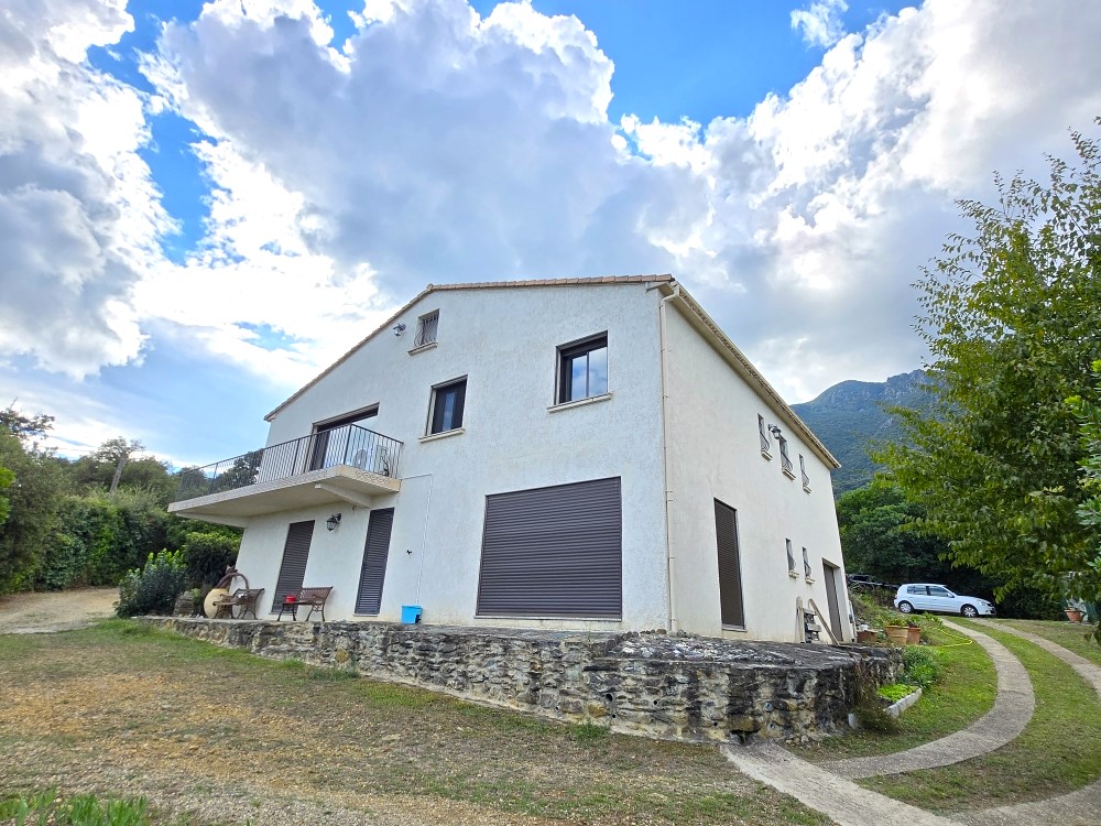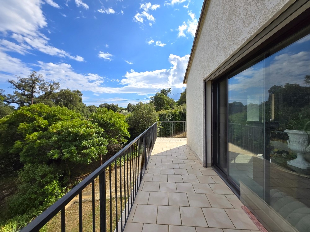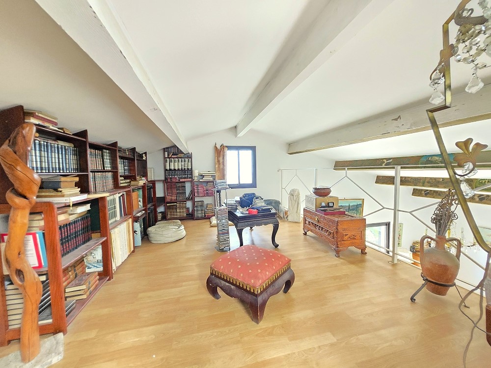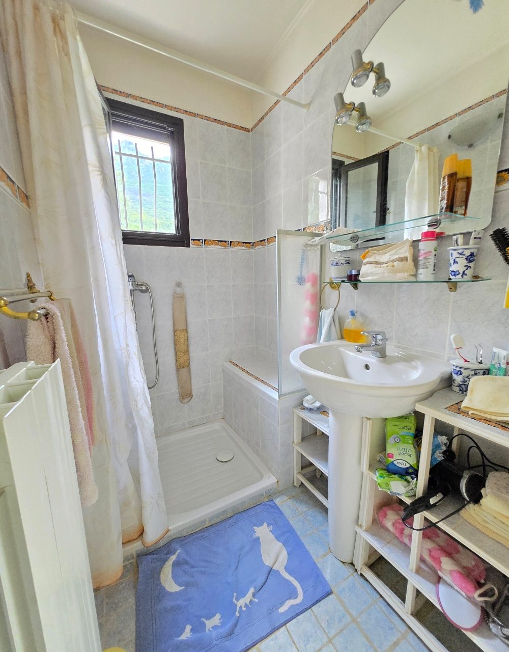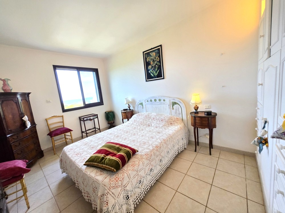 La maison est sur deux niveaux, la partie principale de plain-pied offre une surface habitable de 135 m² environ et se compose d’un hall d’entrée type cathédrale, d’une cuisine fermée avec sa loggia et sa vue montagne, un salon séjour avec mezzanine et sa vue mer, équipée d’un poêle à bois céramique et d’une climatisation réversible, un accès à la terrasse. Le coin nuit dispose de trois chambres, dont une avec sa douche, un bureau ou une 4e chambre, une salle de bains, un WC indépendant.