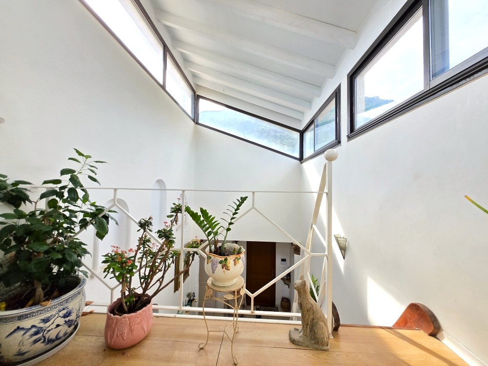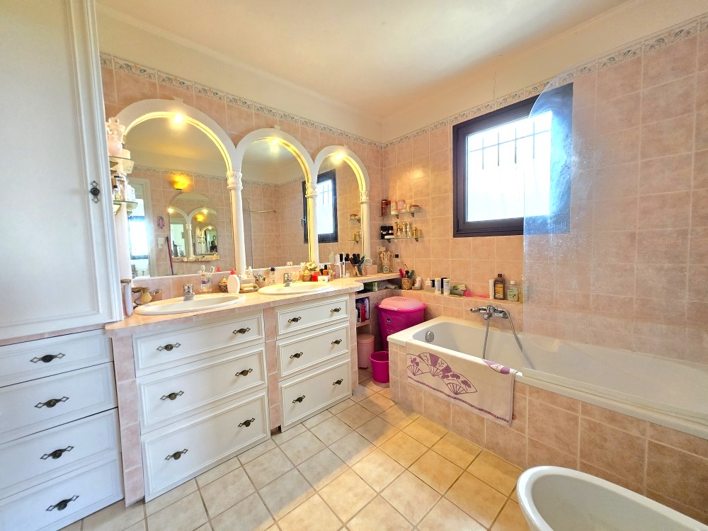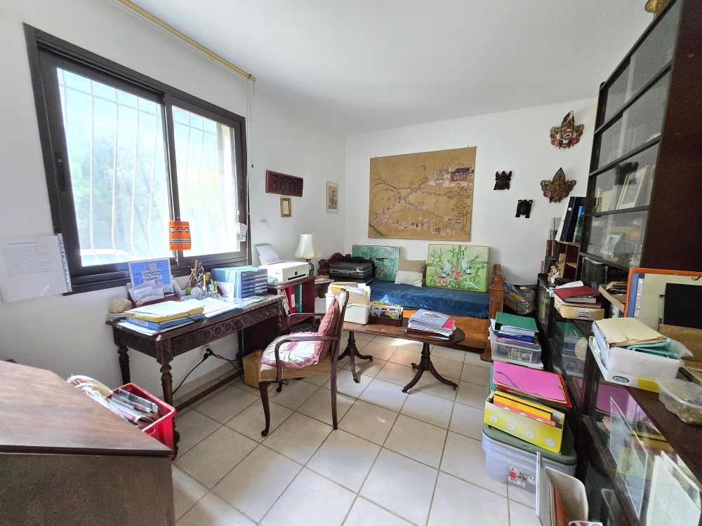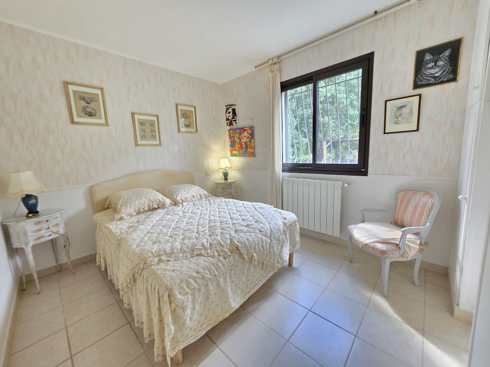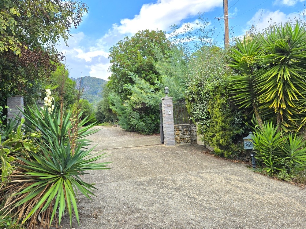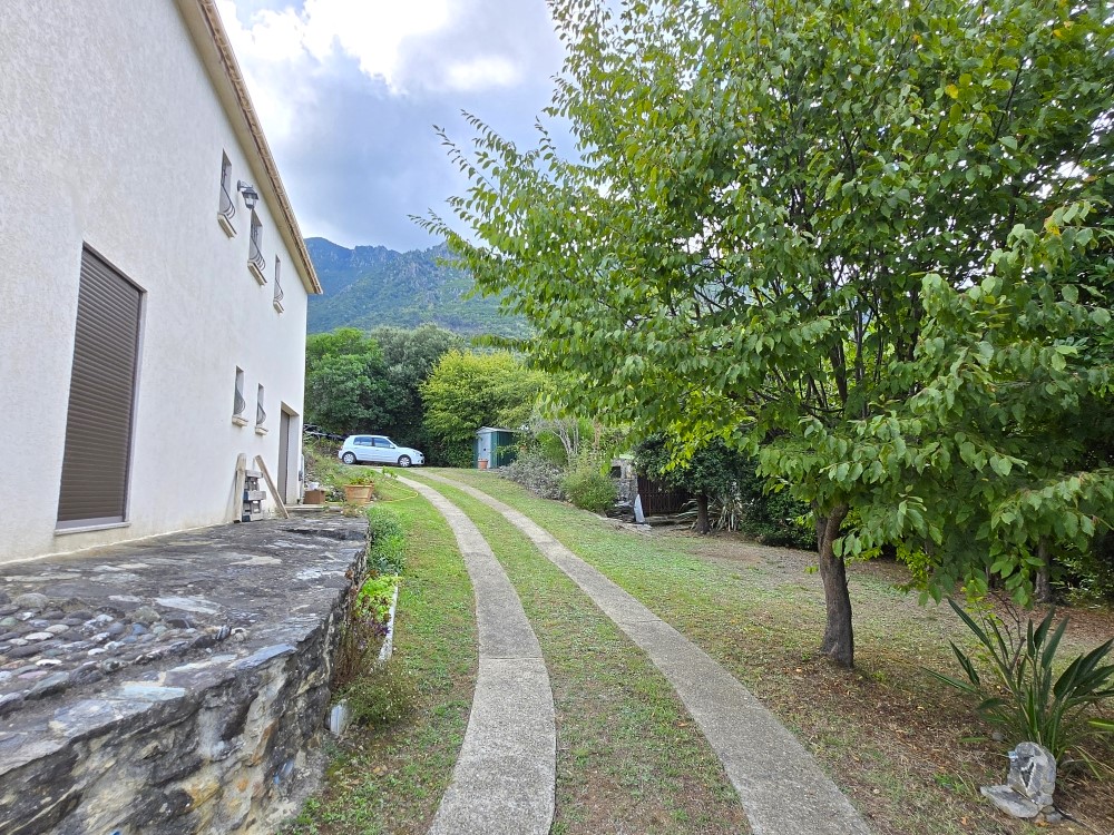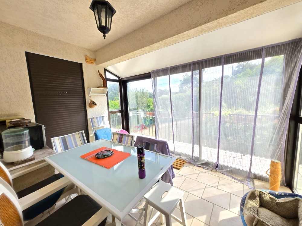 La maison est sur deux niveaux, la partie principale de plain-pied offre une surface habitable de 135 m² environ et se compose d’un hall d’entrée type cathédrale, d’une cuisine fermée avec sa loggia et sa vue montagne, un salon séjour avec mezzanine et sa vue mer, équipée d’un poêle à bois céramique et d’une climatisation réversible, un accès à la terrasse. Le coin nuit dispose de trois chambres, dont une avec sa douche, un bureau ou une 4e chambre, une salle de bains, un WC indépendant.
