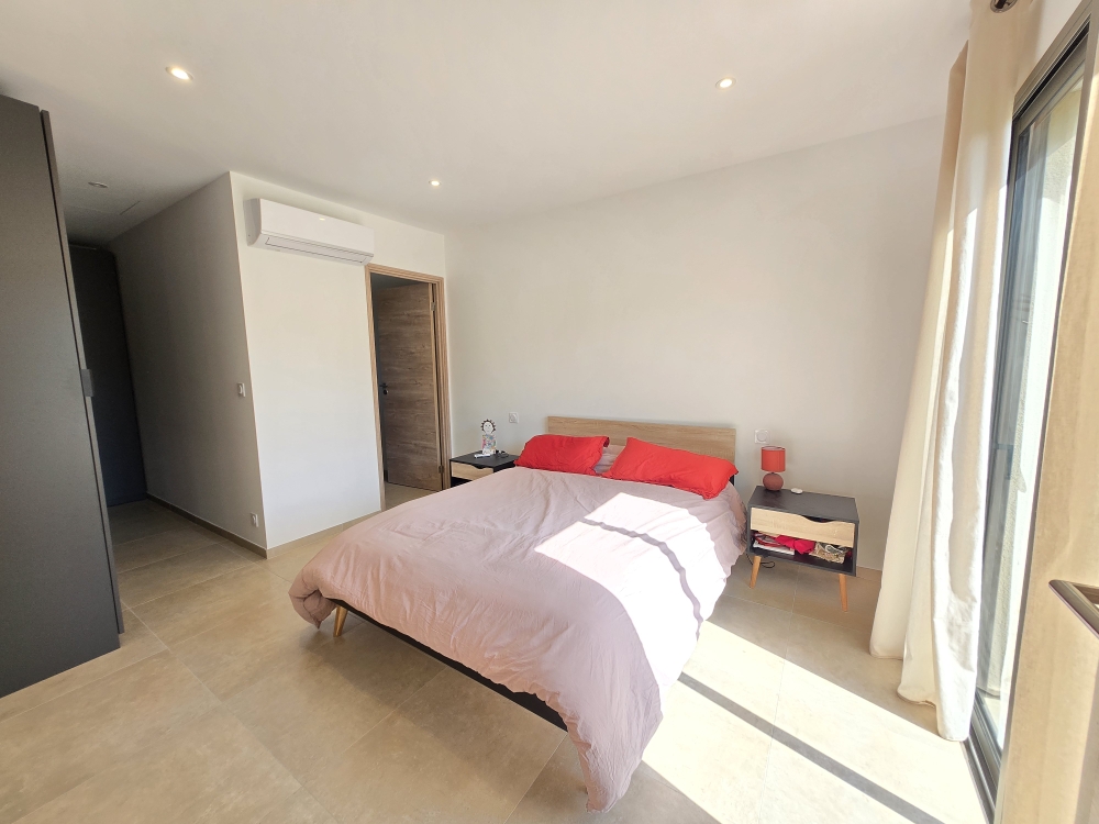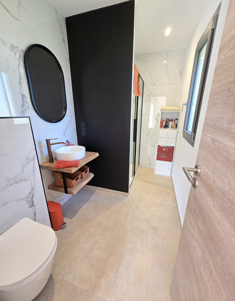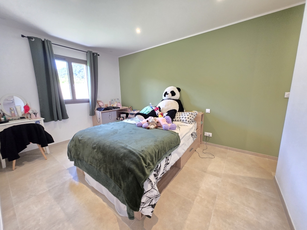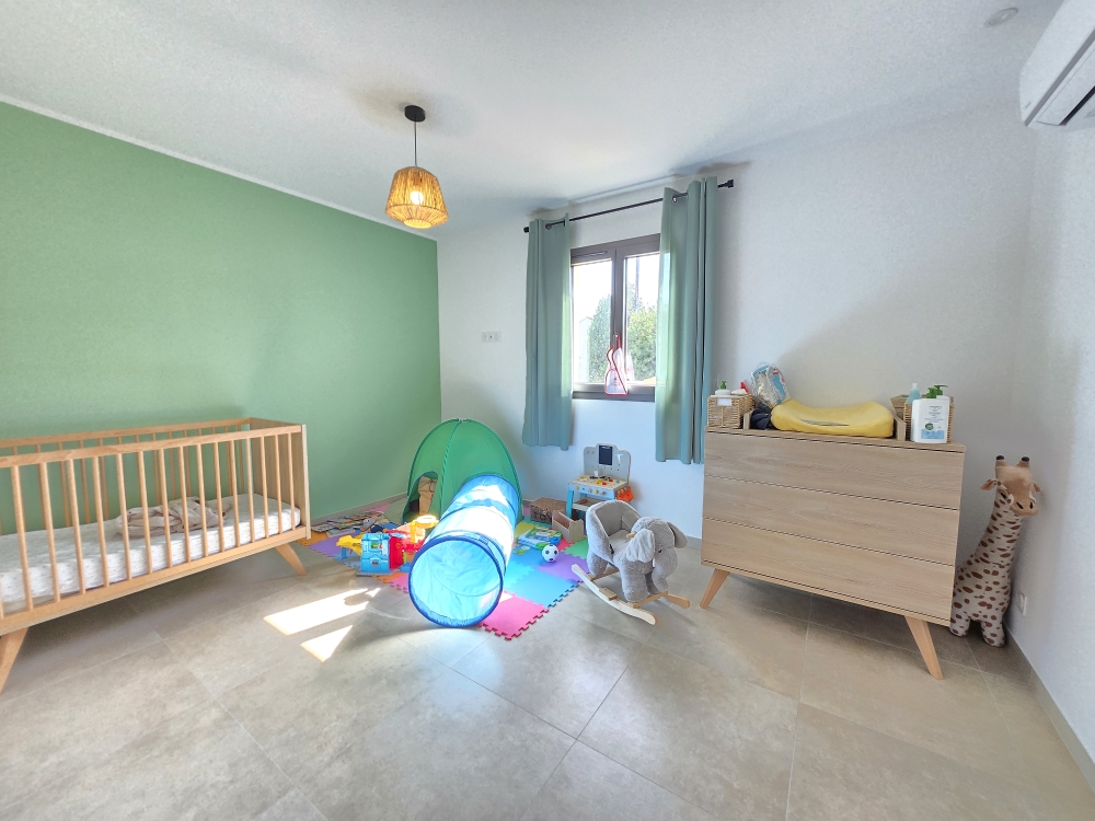 La maison propose quatre chambres : 3 chambres avec dressing situées dans l’espace nuit qui comprend également une salle d’eau, ainsi qu’un WC indépendant; à l’opposé une suite avec une salle d’eau/wc et un dressing.